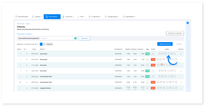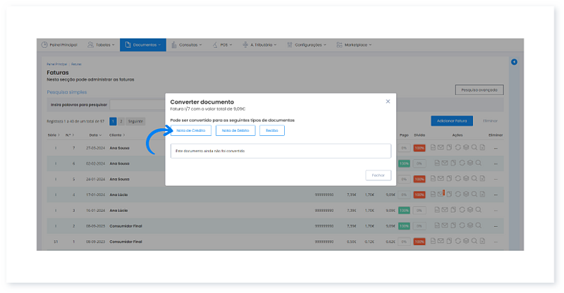 1. Aceda à listagem de documentos e na fatura e clique no ícone Converter.