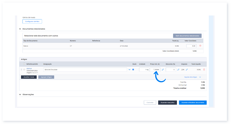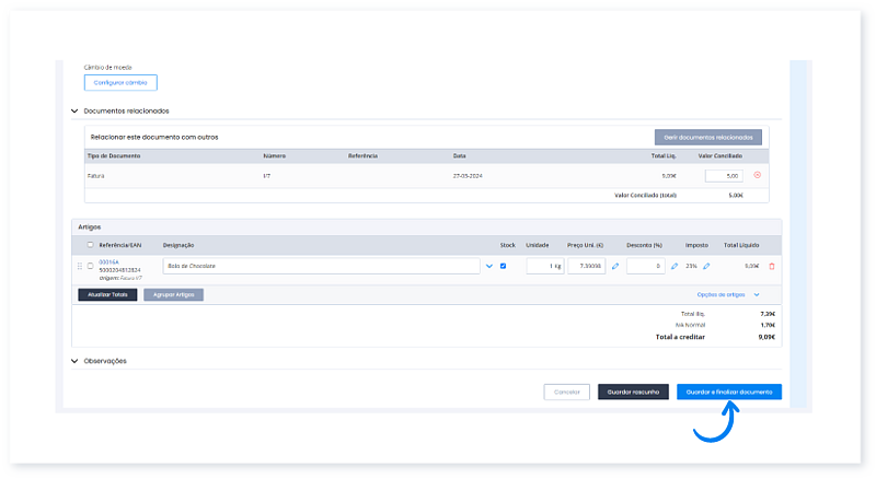 3. É criada automaticamente uma nota de crédito com os dados da fatura. Pode ajustar o valor na linha dos artigos, mas os valores não podem ser superiores aos valores presentes no documento relacionado. Pode ainda eliminar artigos.