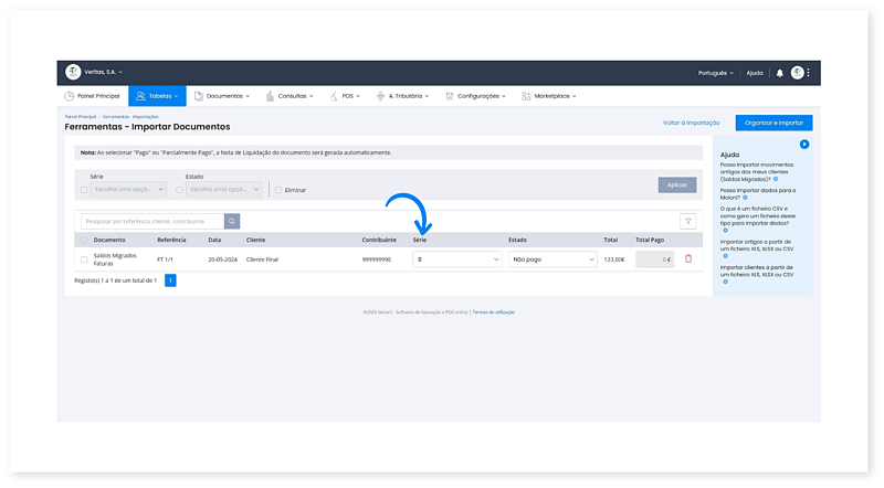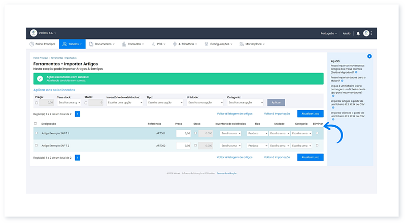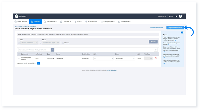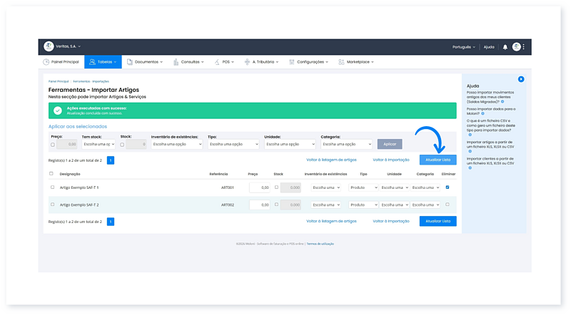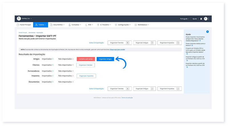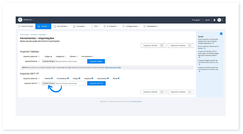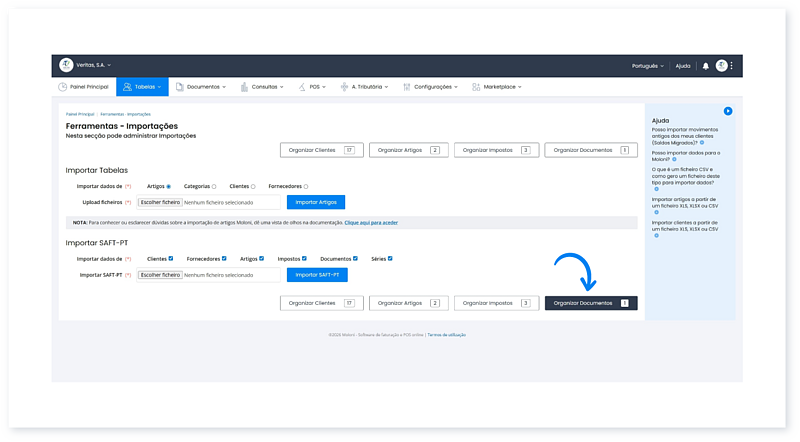 Após concluir a importação de um ficheiro SAF-T (PT), os seus dados (Artigos, Clientes e Documentos) ficam salvaguardados na sua conta.