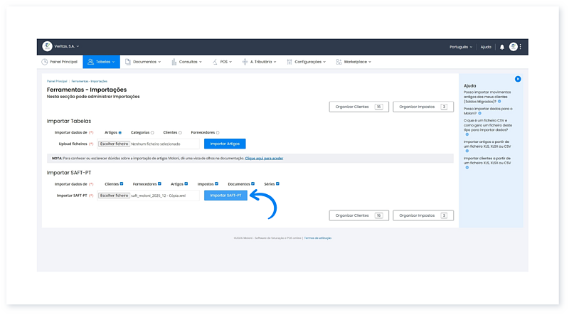 3. Clique em Importar SAFT-PT.