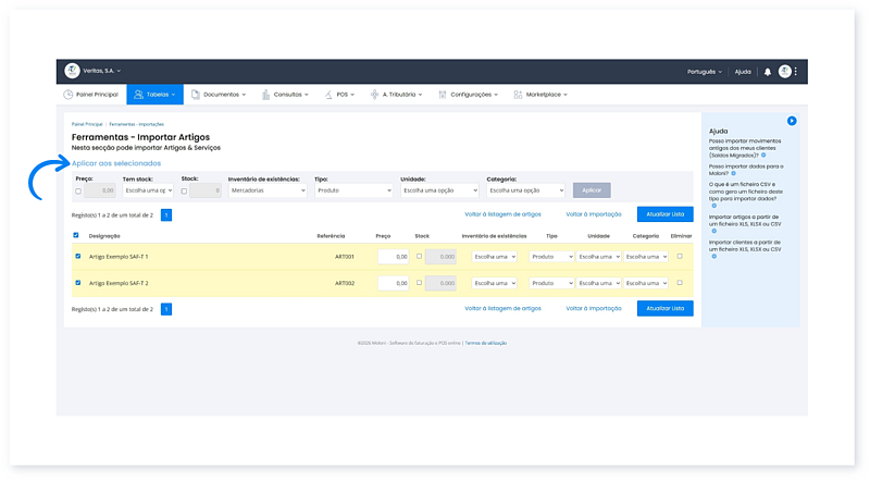 6. Pode utilizar a funcionalidade Aplicar aos selecionados que lhe permite aplicar uma ou mais definições a vários artigos da lista. Para isso, selecione os itens da lista e escolha as propriedades pretendidas.
