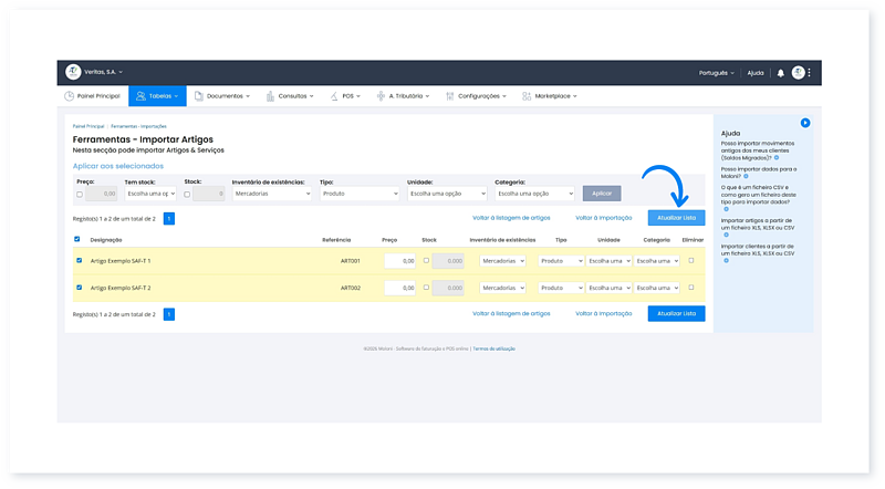 5. Complete os dados de cada artigo, selecionando as opções pretendidas e clique em Atualizar Lista.
