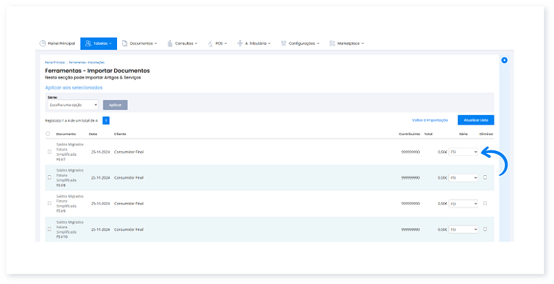 Caso tenha importado documentos, deve atribuir a série pretendida aos documentos.