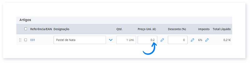 6. Crie uma fatura e adicione o artigo. Introduza um valor menor do que o anterior.