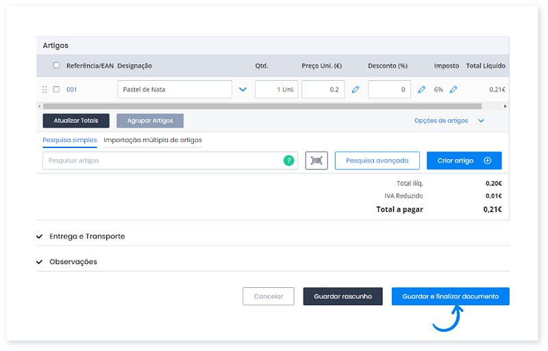 7. Finalize a fatura, clique em Guardar e Finalizar Documento.