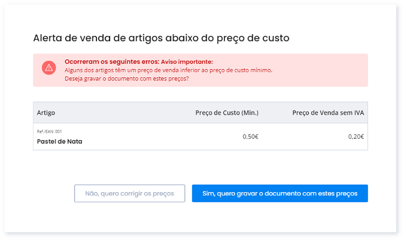 Ao gravar um documento com artigos cujo preço de venda (incluindo descontos) seja menor que o preço de custo, é mostrado um alerta que indica quais os artigos nestas condições e qual o menor preço de fornecedor.
