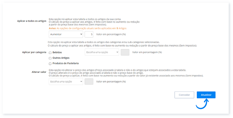 Por outro lado, é possível aplicar uma tabela de preço a uma categoria específica. Saiba como, através desta Guia.