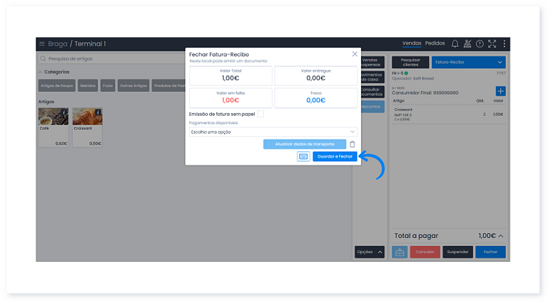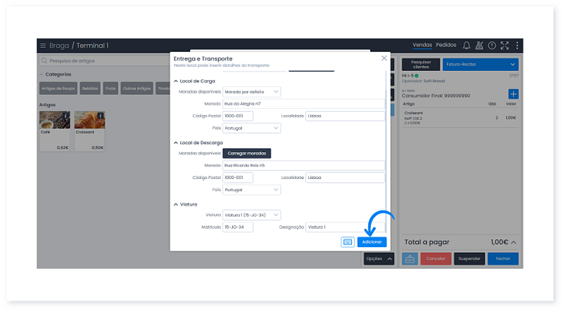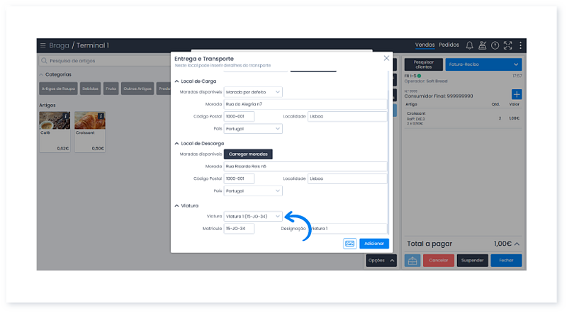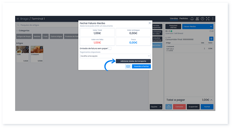 De seguida, com esta funcionalidade ativa, sempre que fechar um documento, encontra o campo Transporte que permite inserir os dados de entrega e transporte relativos à venda efetuada.