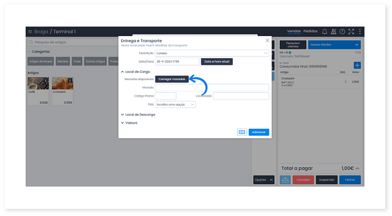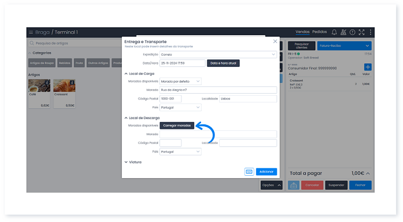 4. Na secção Local de Carga pode inserir uma morada ou selecionar uma morada pré-definida, através do botão Carregar Moradas.