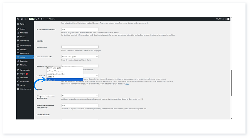 16. No separador Contribuinte do cliente, selecione a opção _billing_vat.