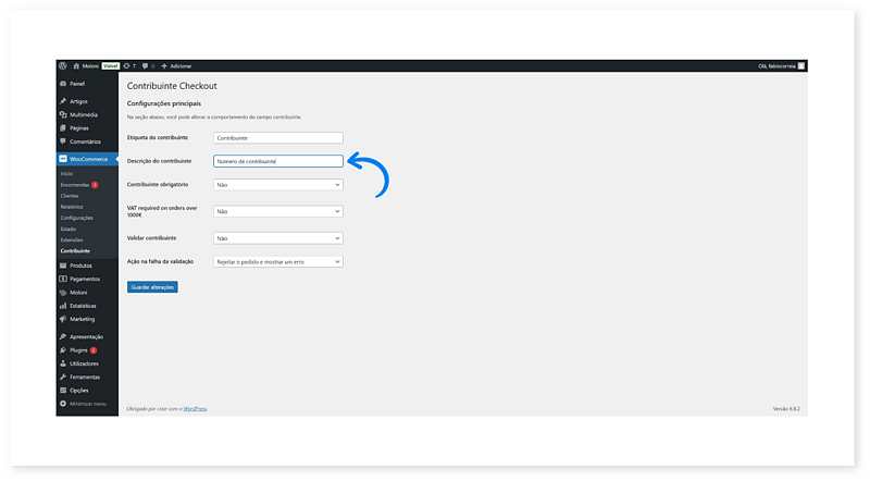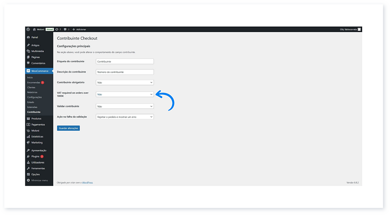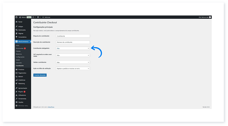 5. Para configurar o plugin, no separador WooCommerce, clique em Contribuinte.