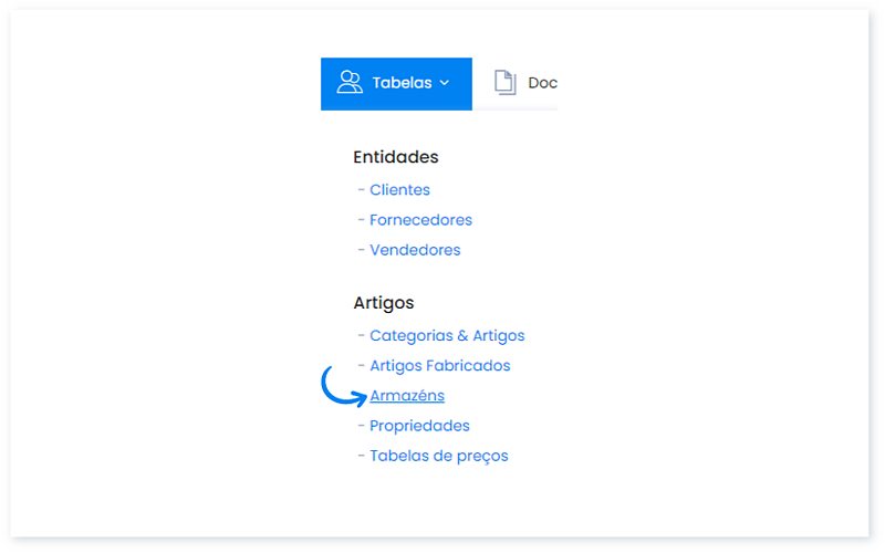 1. Os armazéns adicionados encontra-se no menu Tabelas, através da opção Armazéns.