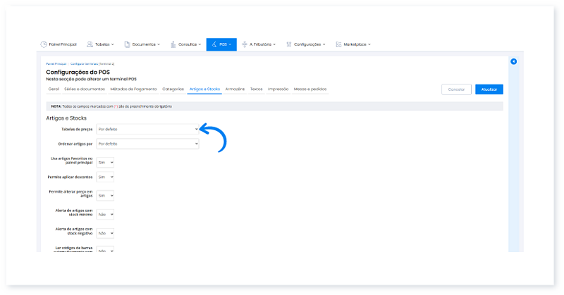 2. No campo Tabela de preços, escolha a tabela de preço que será aplicada por defeito ao terminal. Guarde a informação, clicando em Atualizar.