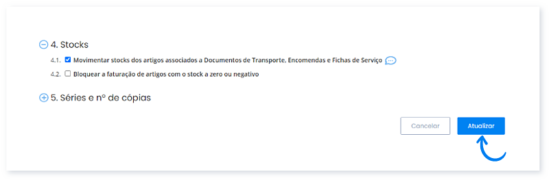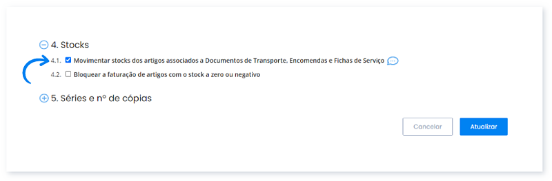 - Ative a opção Movimentar stocks dos artigos associados a Documentos de Transporte, Encomendas e Fichas de Serviço.