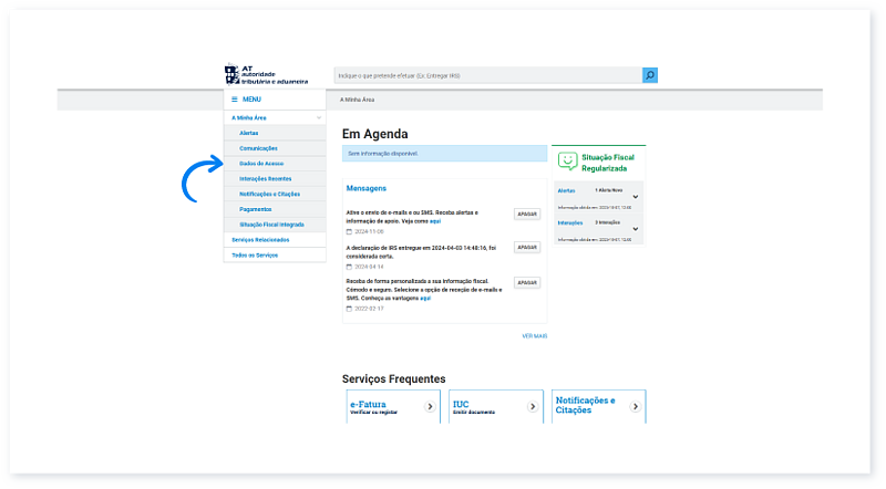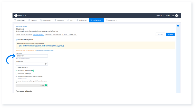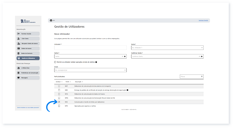 Nota: Caso já tenha um utilizador criado para a comunicação de faturas ou documentos de transporte, basta ativar as permissões referidas.
