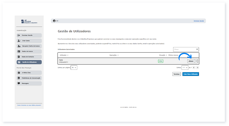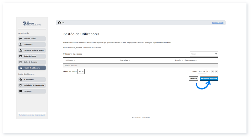 6. Caso não tenha um utilizador atribuído, na Gestão de Utilizadores, clique em Criar Novo Utilizador.