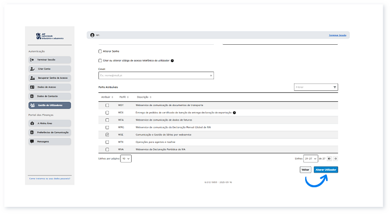5. Nos Perfis Atribuíveis, navegue até à última linha, e ative a caixa de verificação da WSE - Comunicação e Gestão de Séries por webservice e clique em Alterar Utilizador, para guardar as alterações.