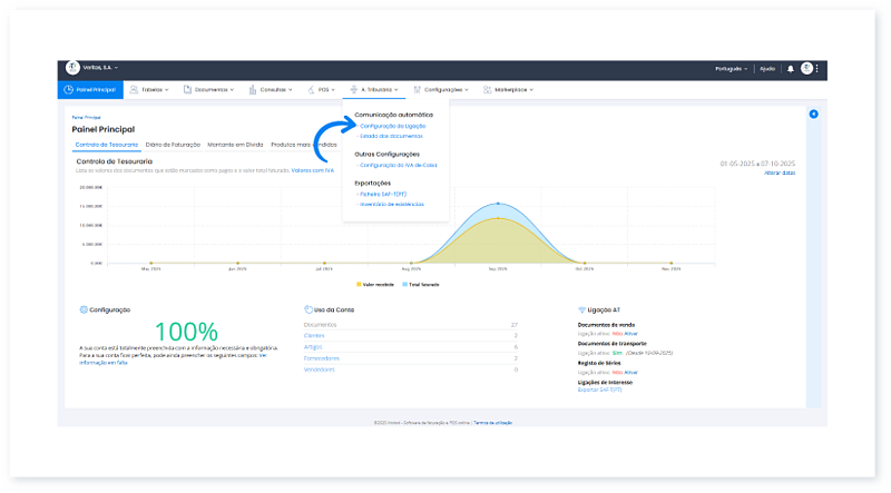 9. Deve configurar a ligação à AT, na sua conta Moloni. Para isso, na Área de Cliente, no menu A. Tributária, clique em Configuração da Ligação.