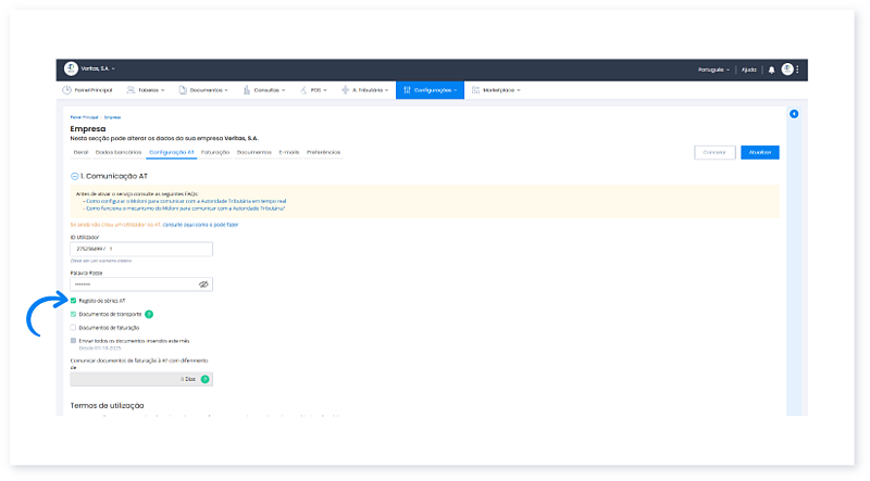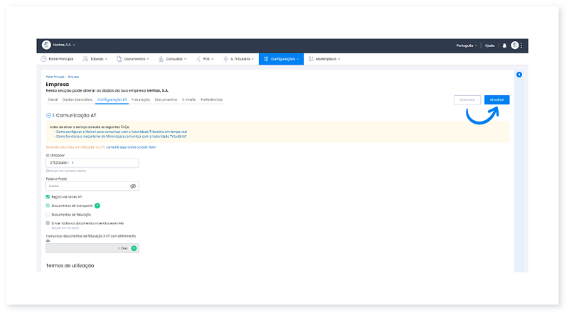 12. Por último, clique em Atualizar. A sua conta está pronta para comunicar séries com a AT.