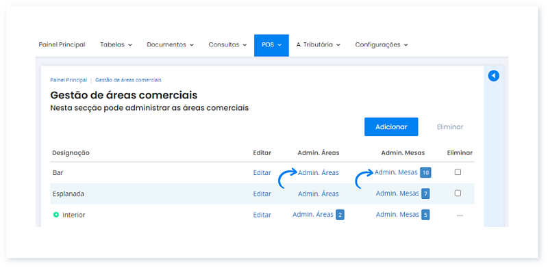 Em Gestão de áreas comerciais pode visualizar uma listagem de todas as áreas inseridas, sendo que em cada uma pode administrar novas áreas e mesas (que podem ser personalizadas), criando uma hierarquia entre elas.