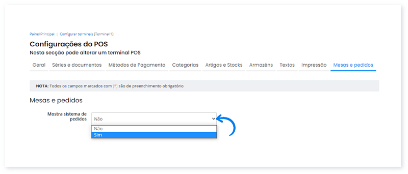 3. No separador Mesas e pedidos selecione a opção Sim.