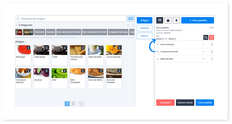 Em cada uma das mesas pode visualizar os dados do pedido e, consequentemente, artigos e dados do cliente.