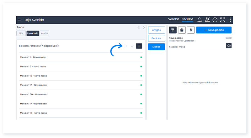 Ao selecionar a área, são-lhe apresentadas todas as mesas ocupadas e desocupadas de uma área.