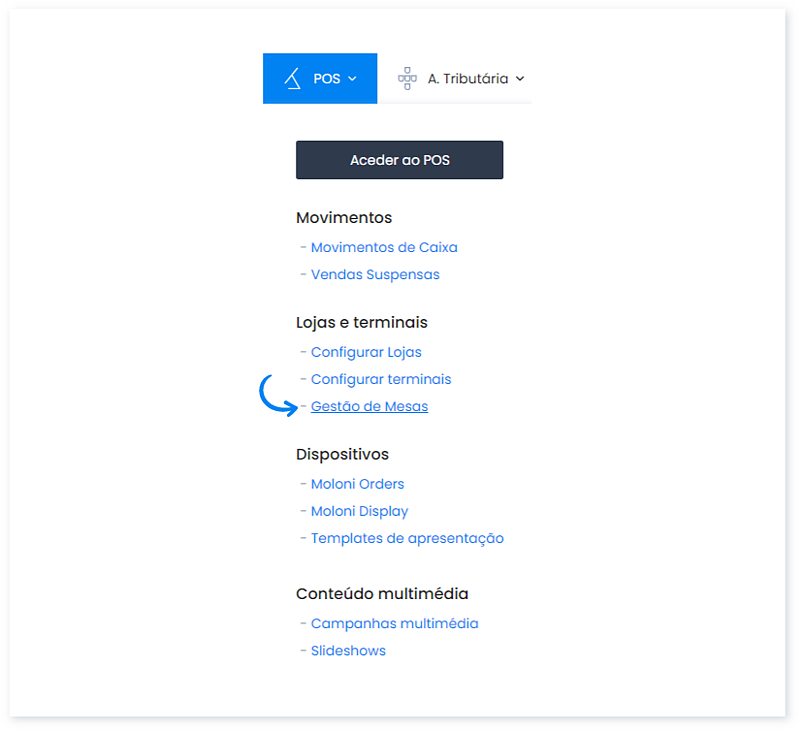Para aceder à Gestão de áreas comerciais, parte do nosso módulo de gestão de mesas, deverá fazê-lo através do menu POS (disponível na Área Cliente Moloni) e clicar em Gestão de Mesas.