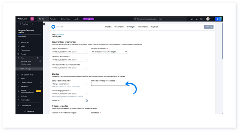 5. Se usar um campo personalizado, deverá preencher com o nome do campo adicional que definiu nas configurações de carrinho do Wix.