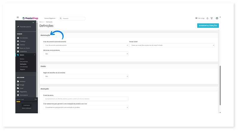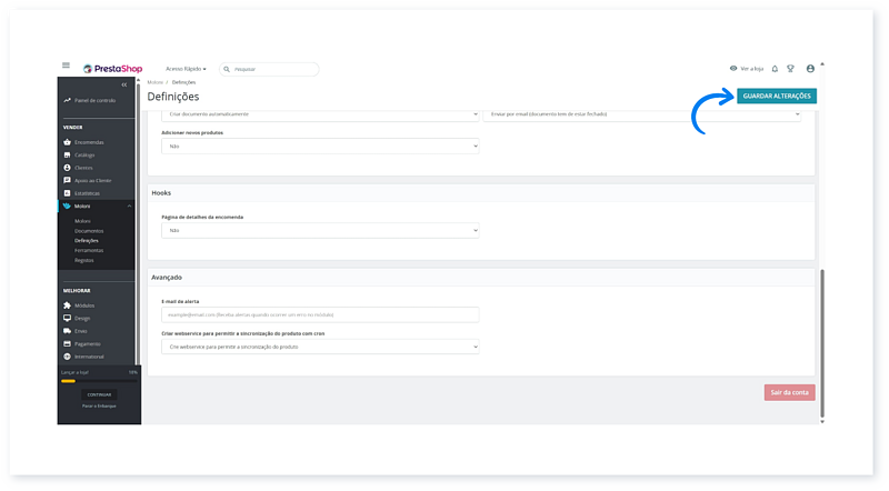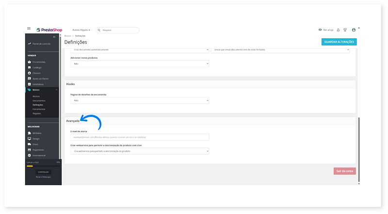 11. No separador Avançado, pode definir um e-mail para notificação de erros e ative a sincronização automática de produtos.