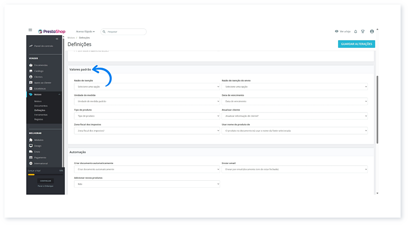8. Na secção Valores padrão, defina os dados a preencher automaticamente nos documentos (ex: unidades, isenções, prazos de pagamento, etc).