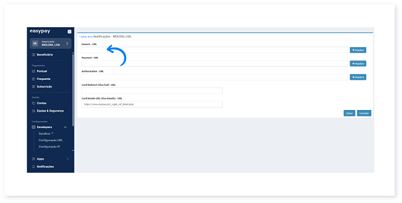 5. Cole o URL do Moloni no campo Generic - URL no backoffice da easypay e clique em Salvar.