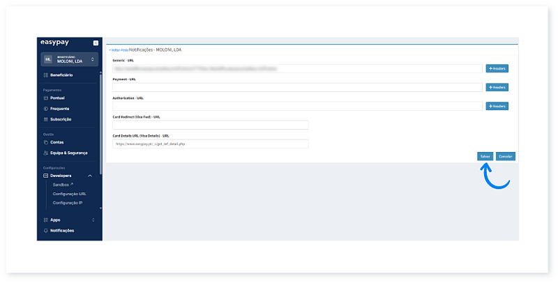 O processo de configuração do URL de notificação no backoffice da easypay está concluído.