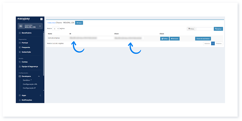 7. Após estes passos é gerado um ID e uma Chave que deve ser copiada para os campos correspondentes no Moloni.