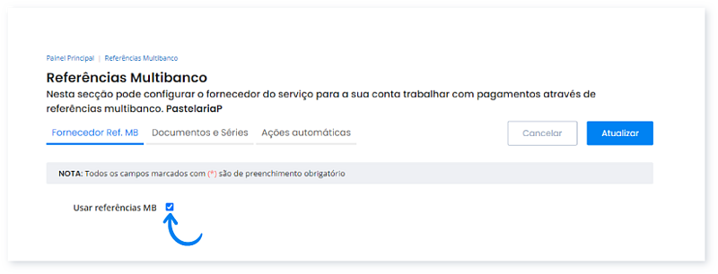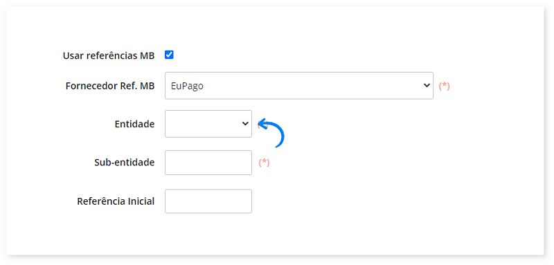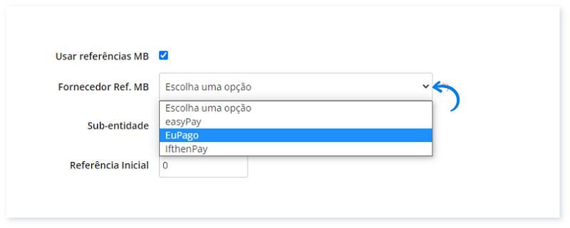 3. No campo Fornecedor Ref. MB, selecione a opção EuPago.