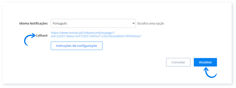 6. Clique em Atualizar. De seguida, copie a informação contida no campo Callback e envie por email para geral@eupago.pt