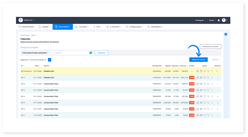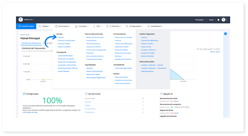 1. Aceda à Área de Cliente para a emissão de um novo documento. Para este exemplo, aceda ao menu Documentos e clique em Faturas para criar uma fatura.