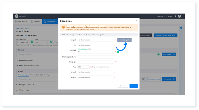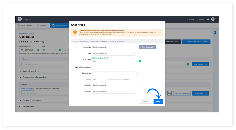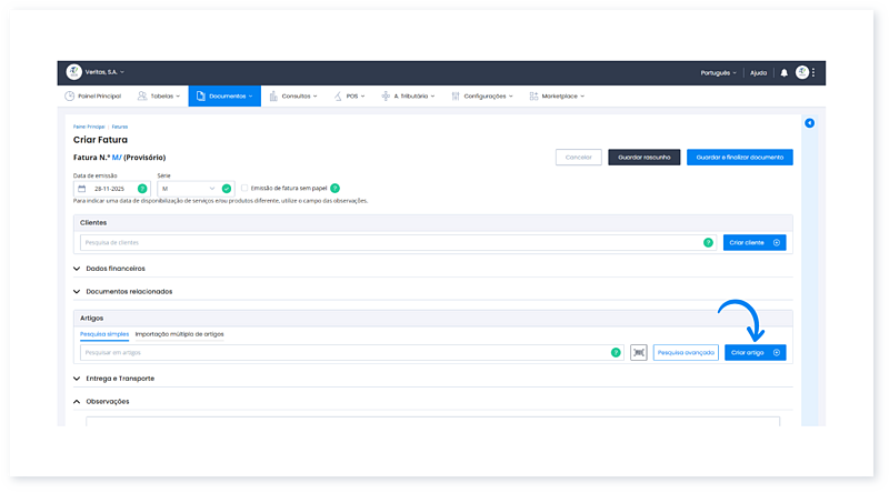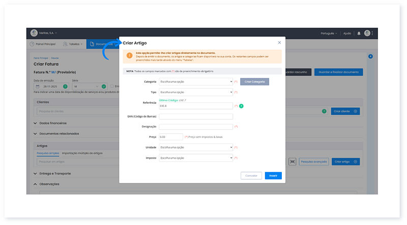 Durante a emissão de um documento, pode criar artigos sem interrupções.