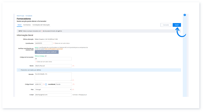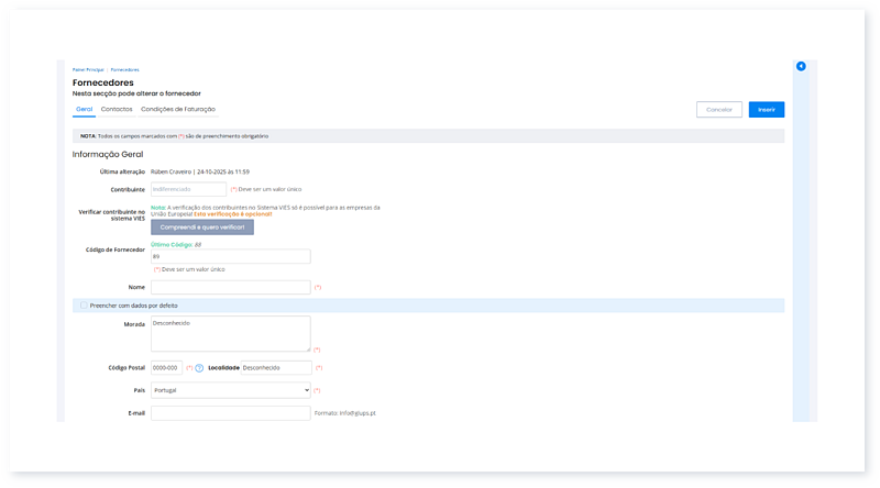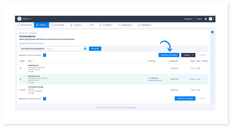 Basta introduzir alguns dados essenciais, como o contribuinte, nome e a morada, e o fornecedor é registado.
