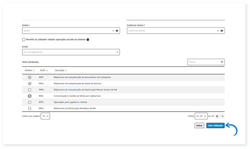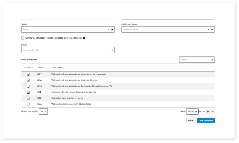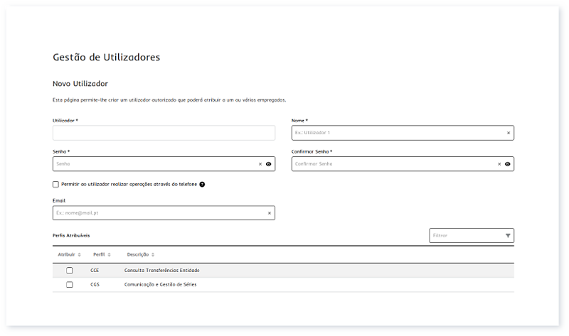 Ao criar um utilizador é necessário atribuir-lhe um nome para referência, uma palavra-passe, um e-mail de contacto (onde irá receber notificações sobre as comunicações feitas) e definir as permissões para executar ações.