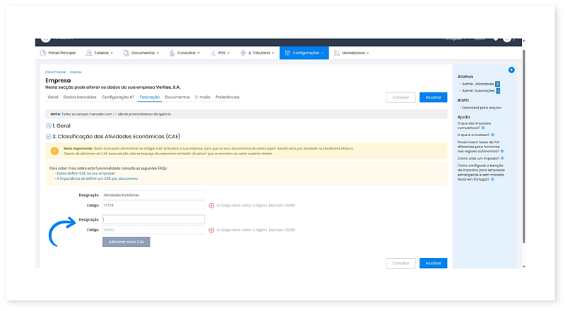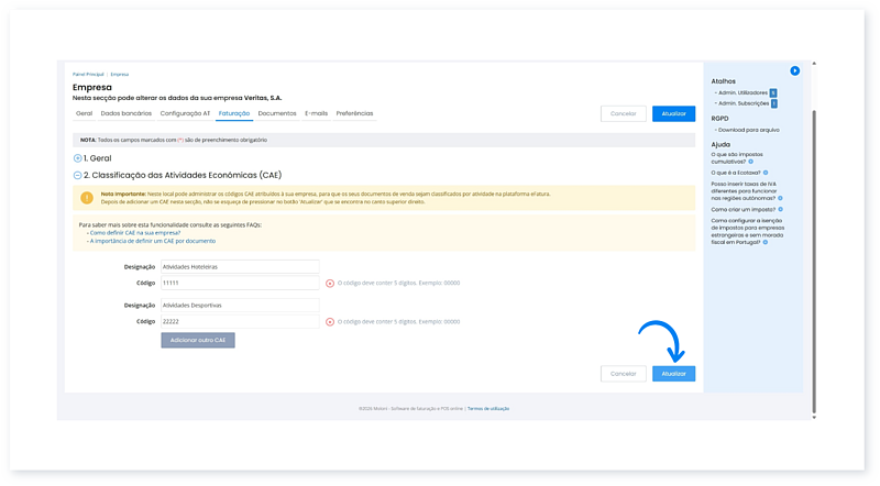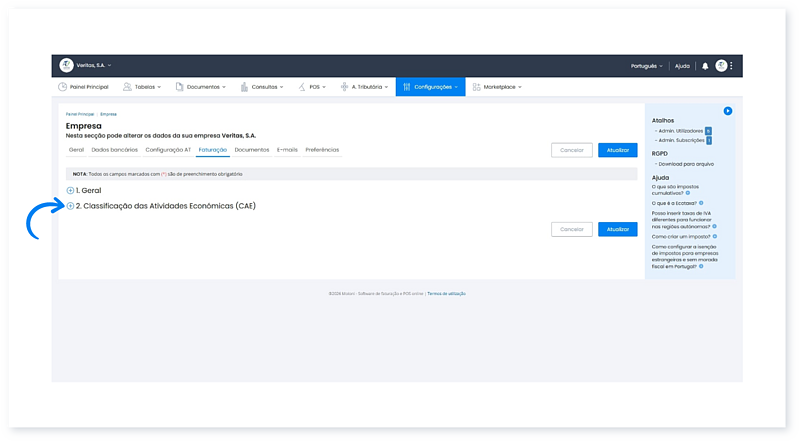 Mediante o plano Moloni que tiver subscrito, poderá ou não adicionar vários C.A.E.