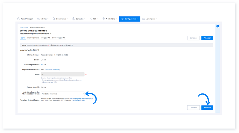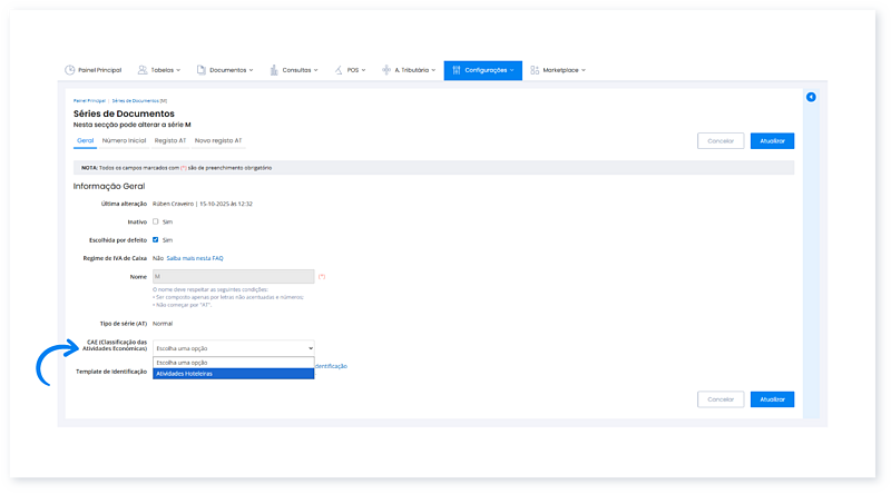 Assim que adicionar um C.A.E. à sua empresa, este ficará disponível para seleção nas definições das suas séries.