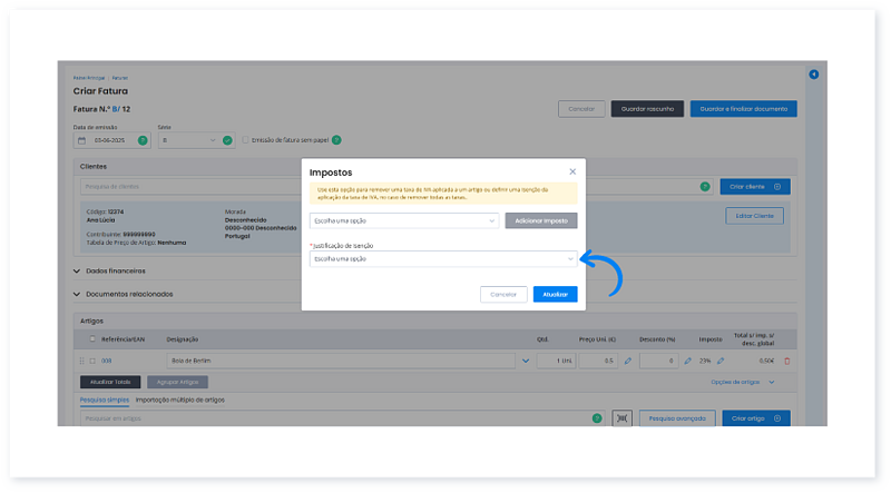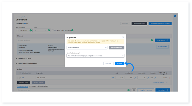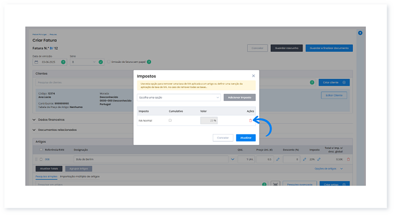 1. Na fatura que está a emitir, em cada artigo inserido, na coluna Imposto clique no ícone de editar.