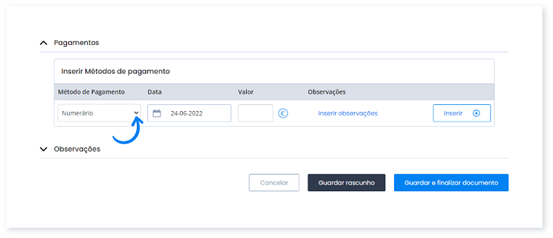 5. Pode, através da secção Pagamentos, especificar o método de pagamento utilizado para a devolução.