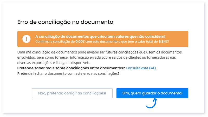 7. Visualiza uma mensagem de alerta a indicar-lhe que o valor da conciliação não coincide. No entanto, finalize o documento, escolha a opção Sim, quero guardar o documento.
