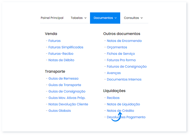 1. Aceda ao menu Documentos e clique na opção Notas de Crédito.