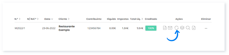 8. O documento pode ser impresso ou enviado por e-mail através da coluna Ações. Este documento não contém valor contabilístico, tratando-se apenas de um movimento que permite controlar a conta corrente do cliente.