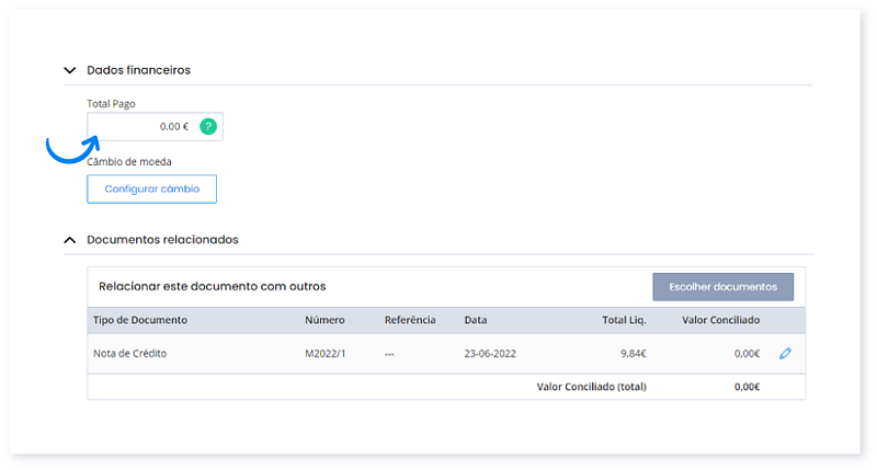 4. Está a criar um novo documento de Devolução de Pagamento. No campo Total Pago, insira o valor correspondente, ou seja o da nota de crédito. Esse valor pode ser visualizado na secção Documentos Relacionados.