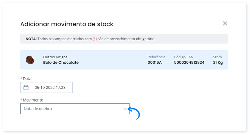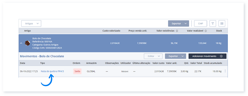 Nota de quebra - Este movimento permite registar a falta de um artigo através da emissão de um documento comprovativo - uma Nota de quebra.