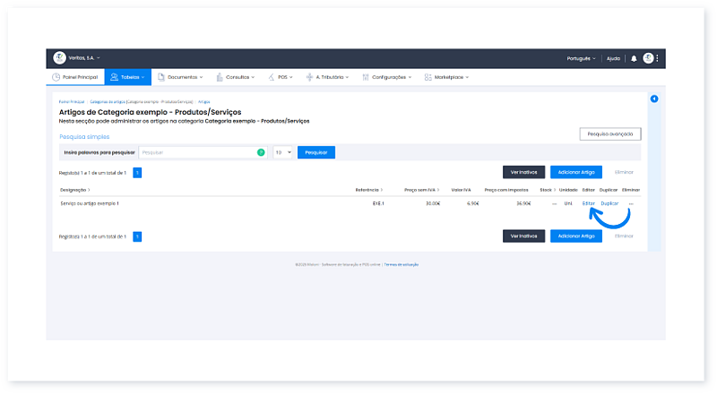 - Procure o artigo pretendido, e clique em Editar para aceder à sua ficha de detalhe.